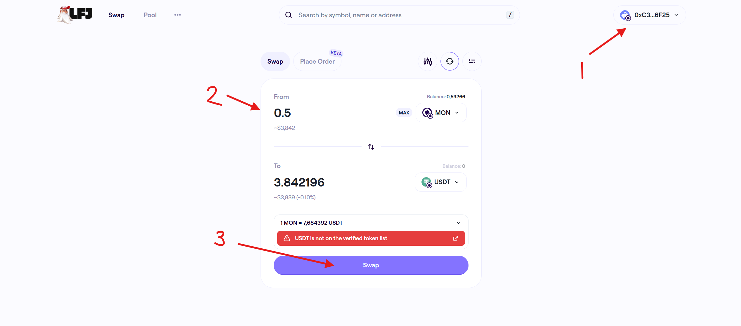 3. Vào trang web, kết nối ví và thực hiện giao dịch bằng LFJ.