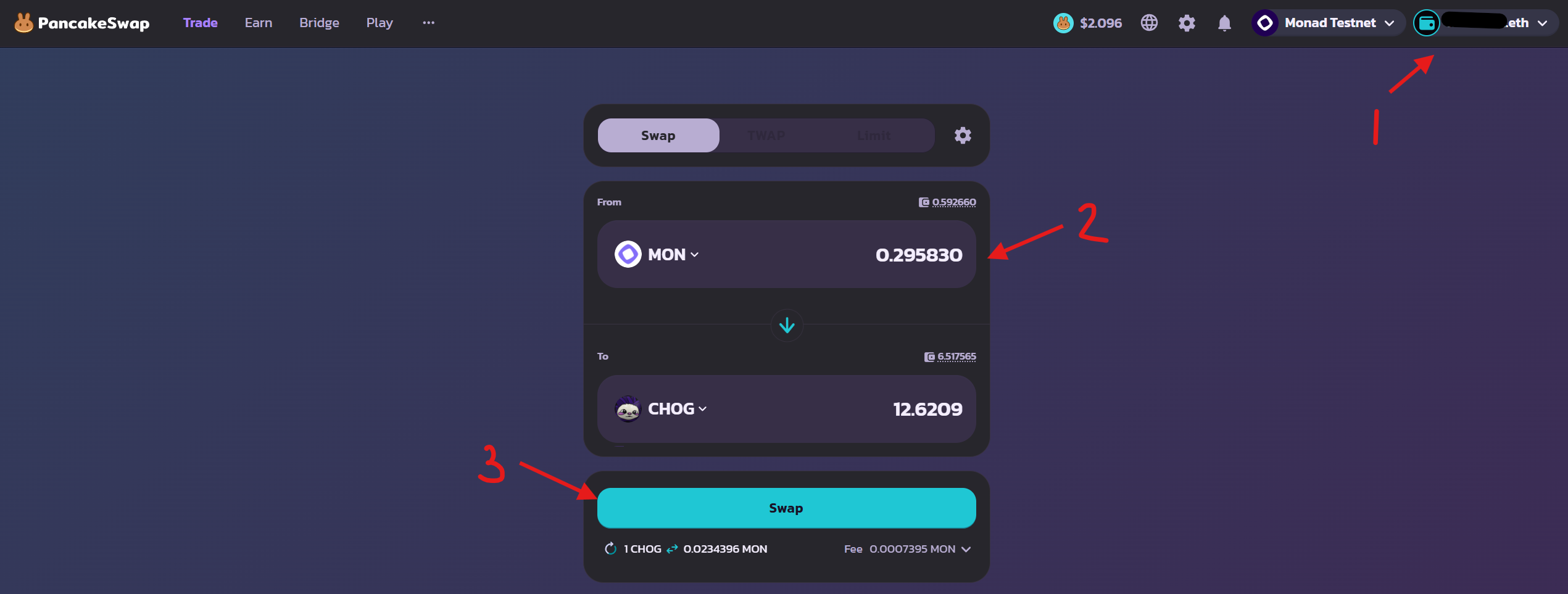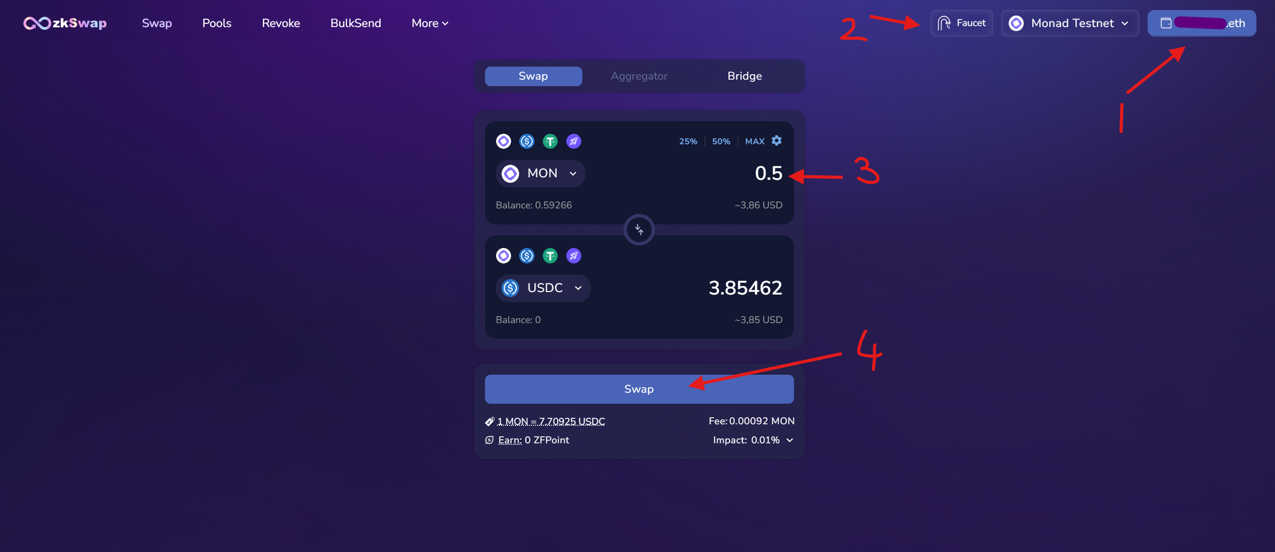 7. Vào website Monorail website và kết nối ví của anh em. Swap các token testnet có sẵn.