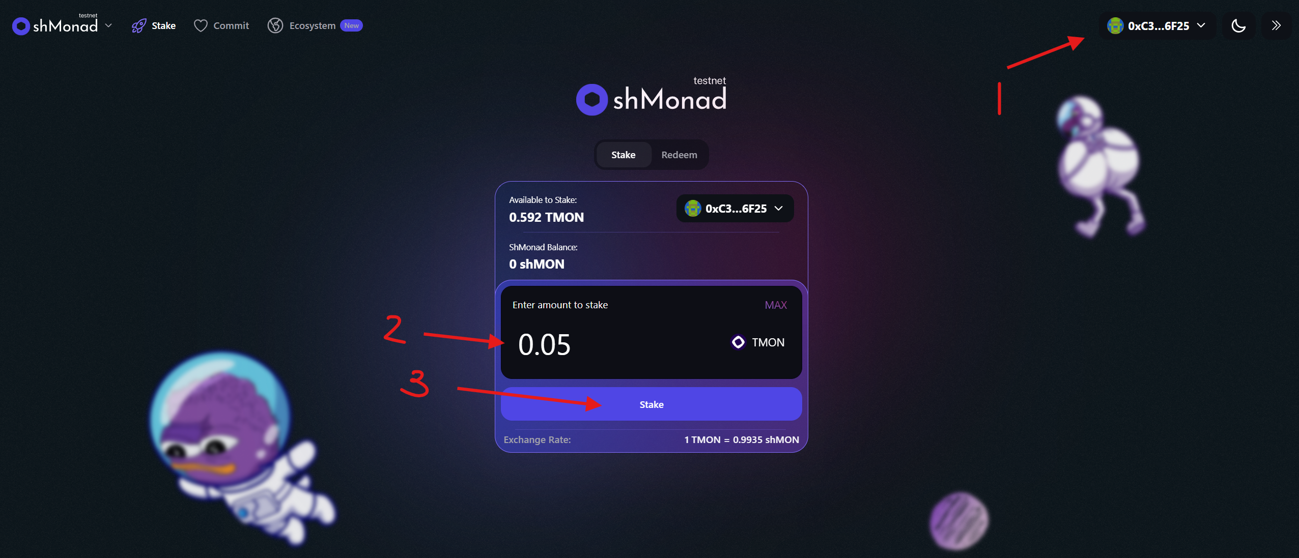 6. Stake $MON. Chúng tôi vào trang web Shmonad, kết nối ví và stake coin test.