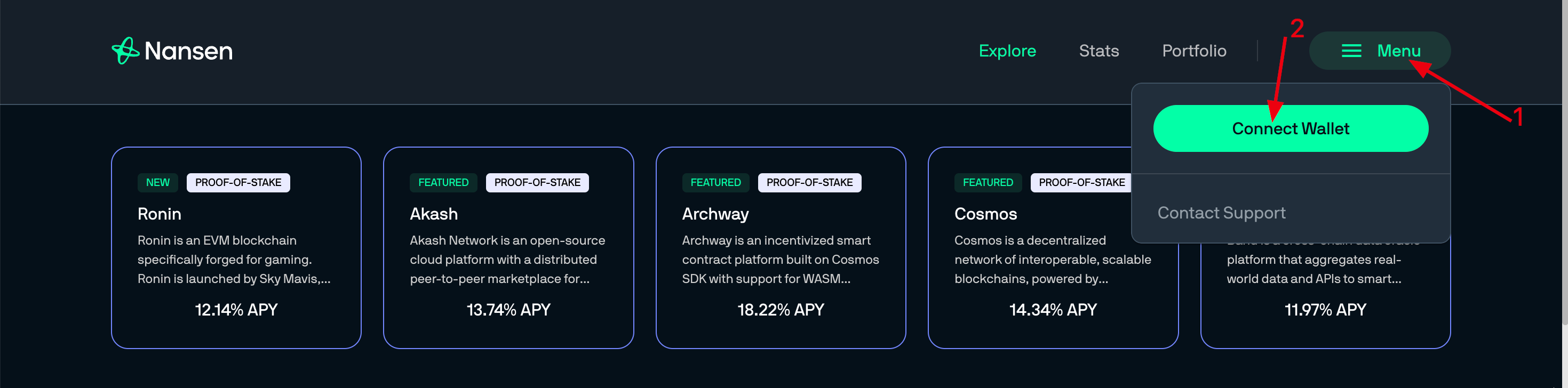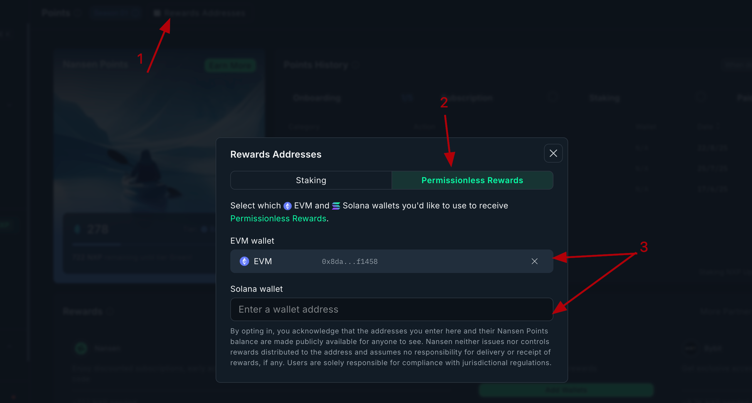 1. Go to the Nansen website, click Rewards addresses, select Permissionless Rewards, and connect your wallets.