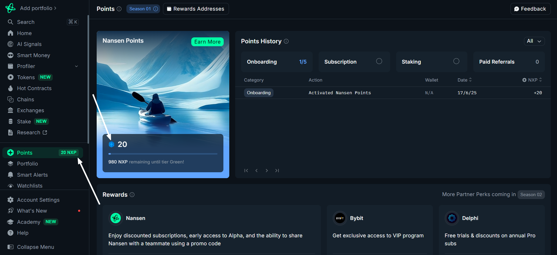 Nansen đã ra mắt Nansen Points: Season 01. Giờ đây, điểm không chỉ có thể kiếm được thông qua staking mà còn bằng cách hoàn thành các hoạt động khác nhau!
