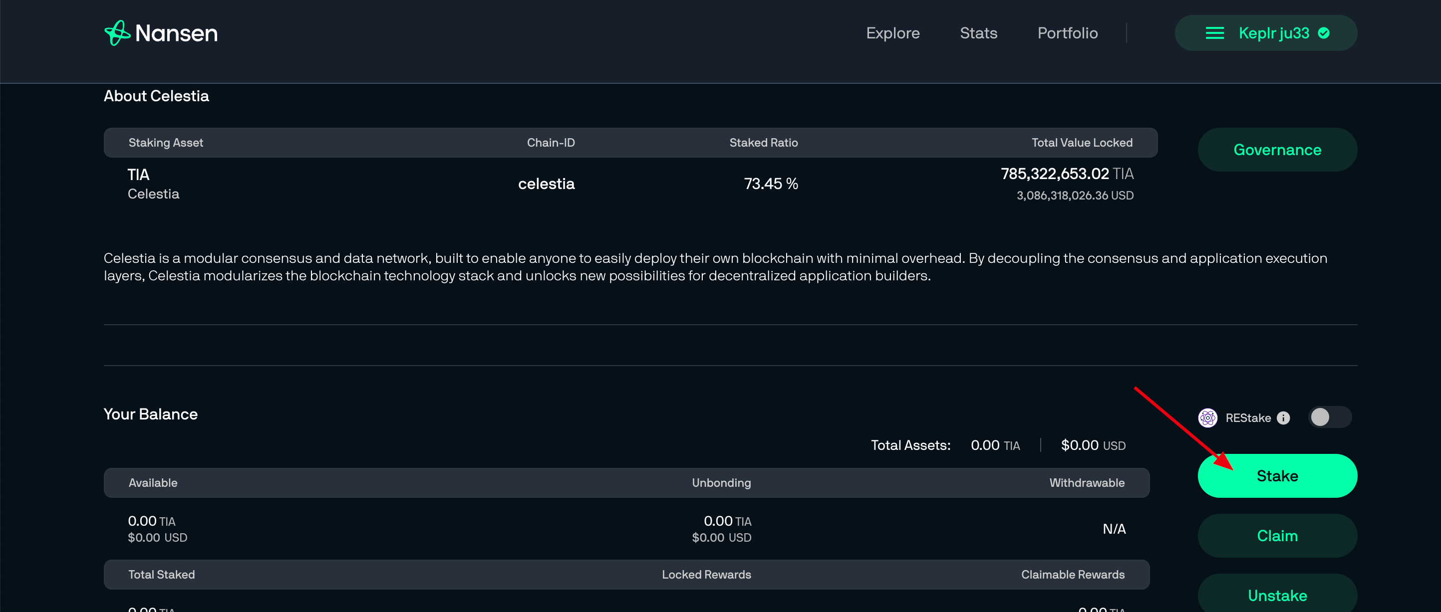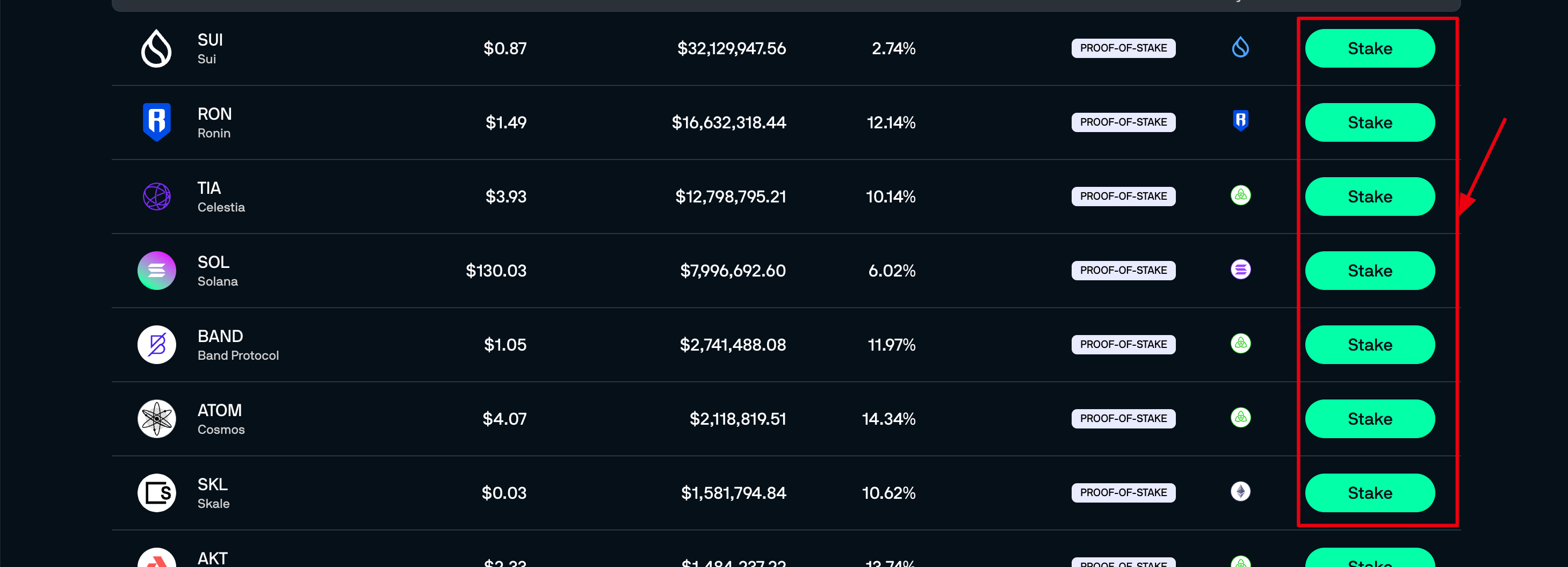 2. Chọn tài sản bạn muốn stake và nhấp vào Stake: