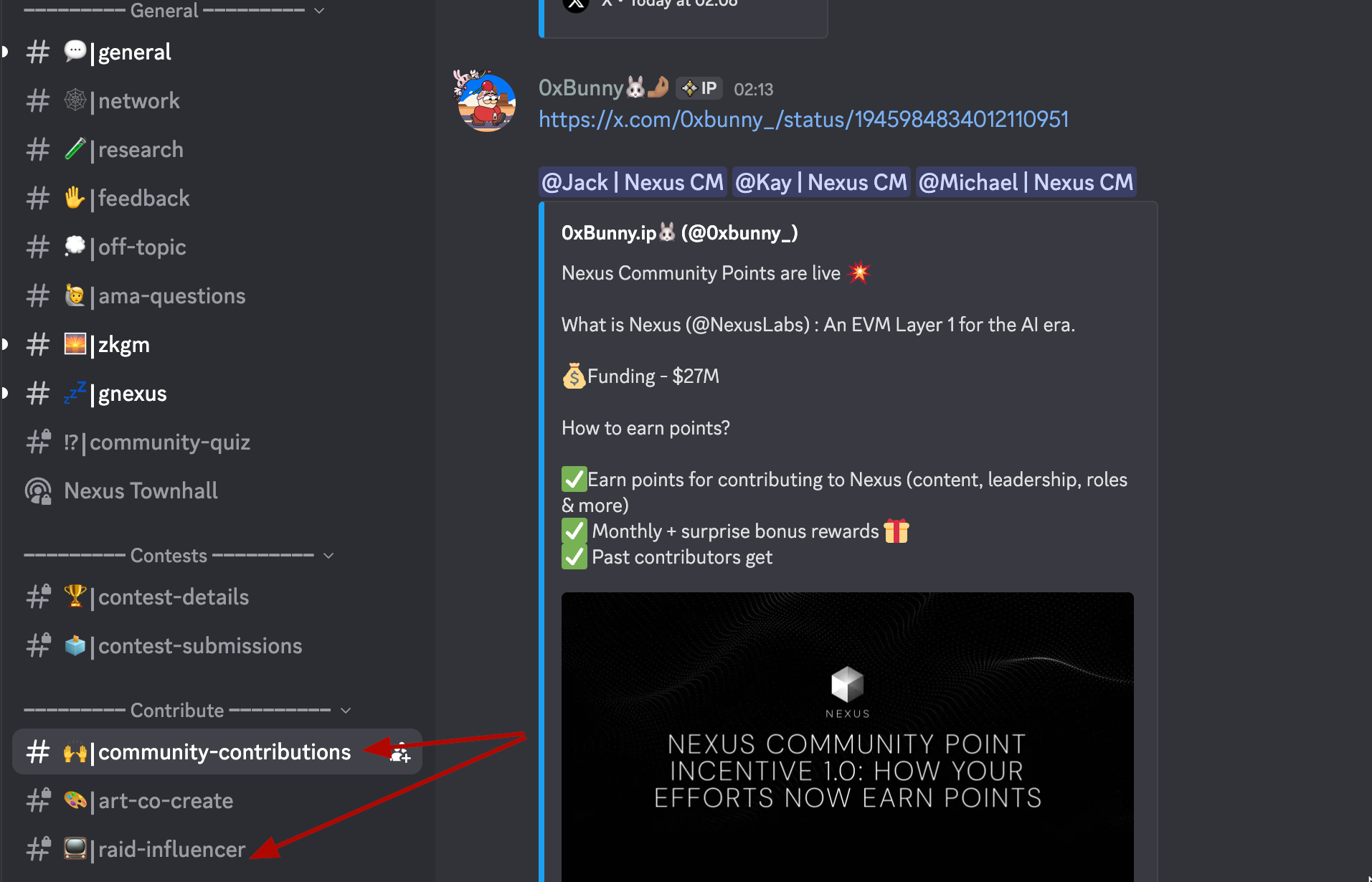 1. Tạo nội dung về dự án trên Twitter/Discord và gửi bài đăng của bạn đến kênh #community-contributions hoặc #raid-influencer (dành cho những người có hơn 1.000 người theo dõi):