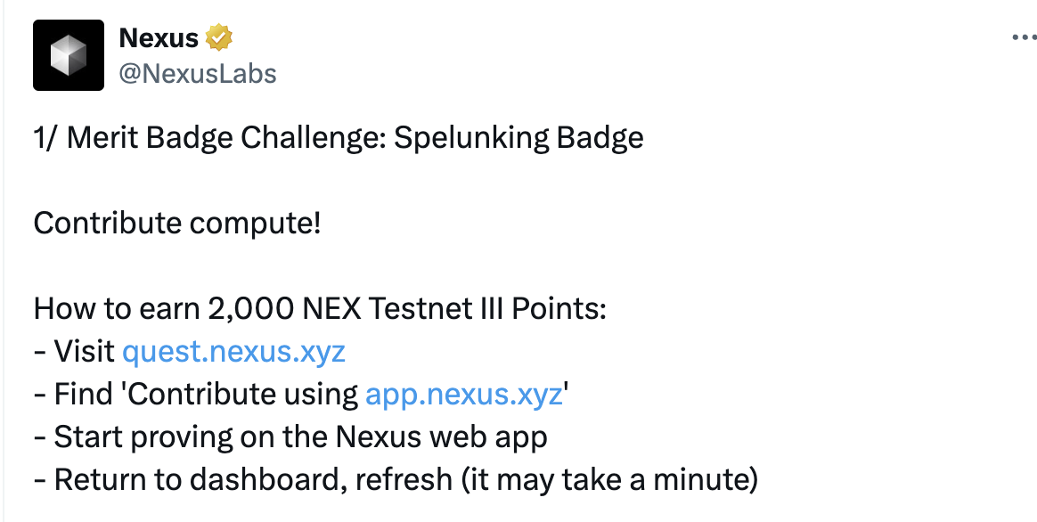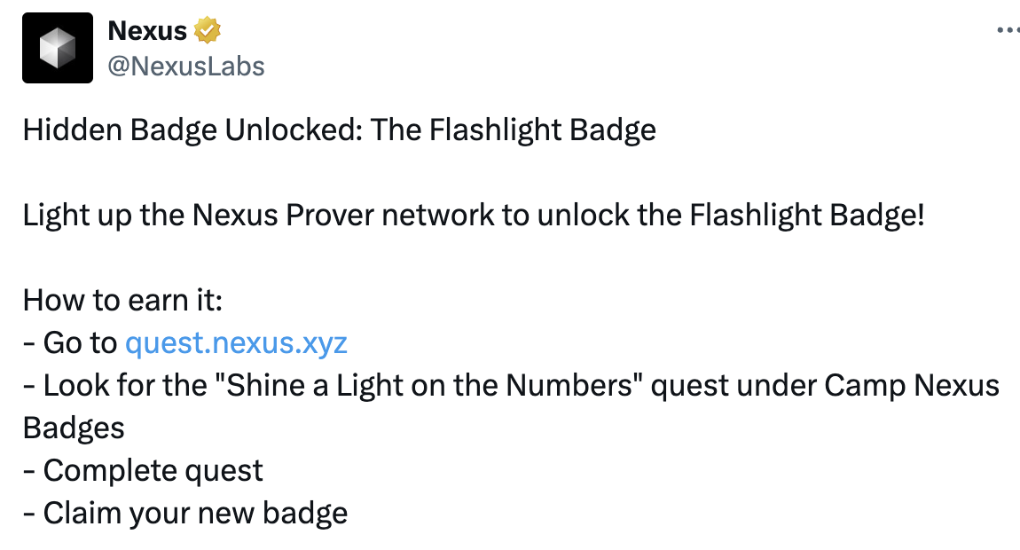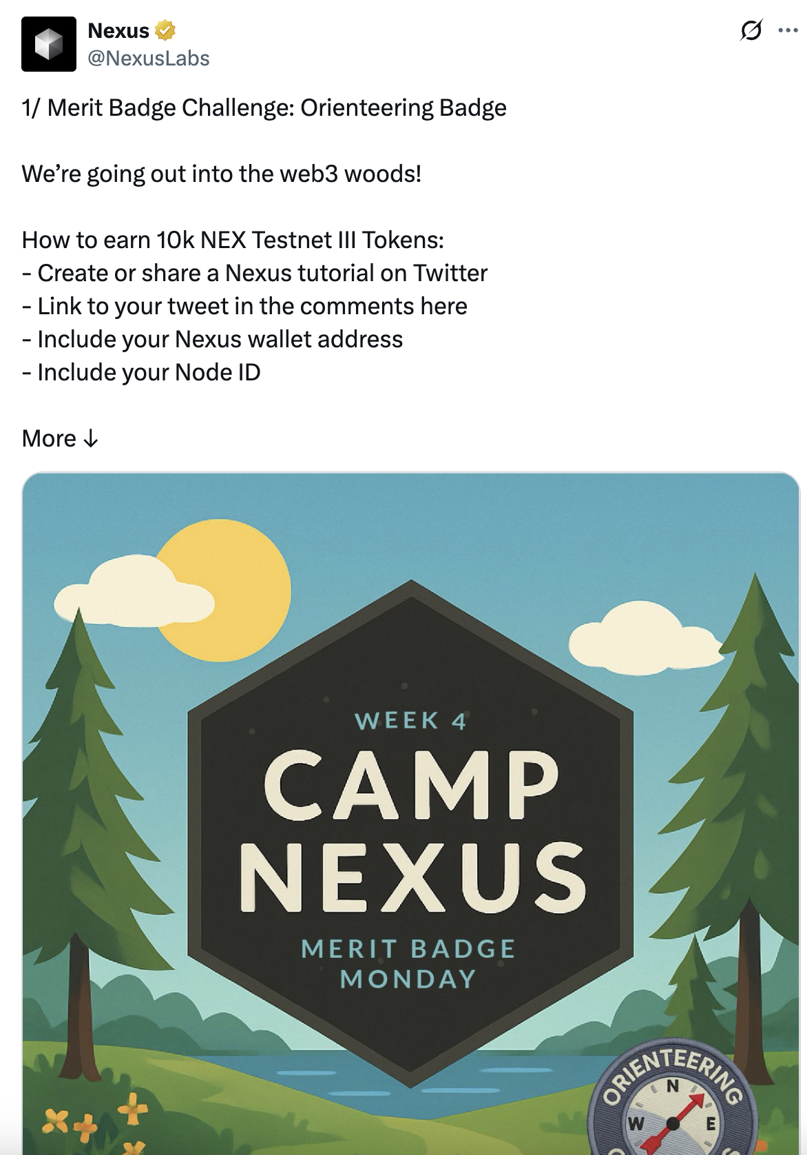 Nexus has announced a new badge as part of the Camp Nexus campaign. To complete the task, create a guide about the project on X, send a link to it, and specify your wallet address and Node ID.