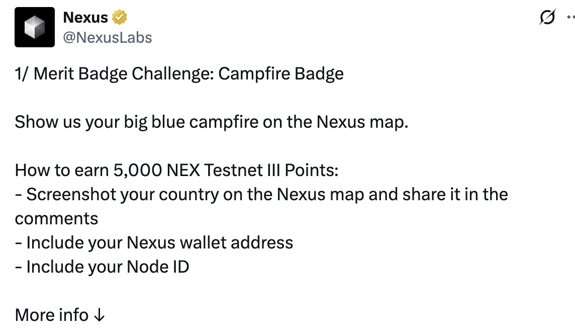 Nexus has announced a new badge as part of the Camp Nexus campaign. To complete the task, take a screenshot of your position on the leaderboard and enter your wallet address and Node ID.