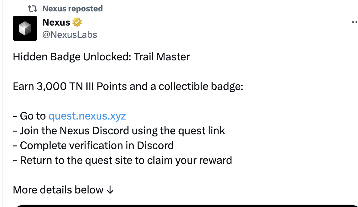 Nexus has announced a new badge as part of the Camp Nexus campaign. To complete the task, join Discord using the link on the quest portal and complete the verification process.
