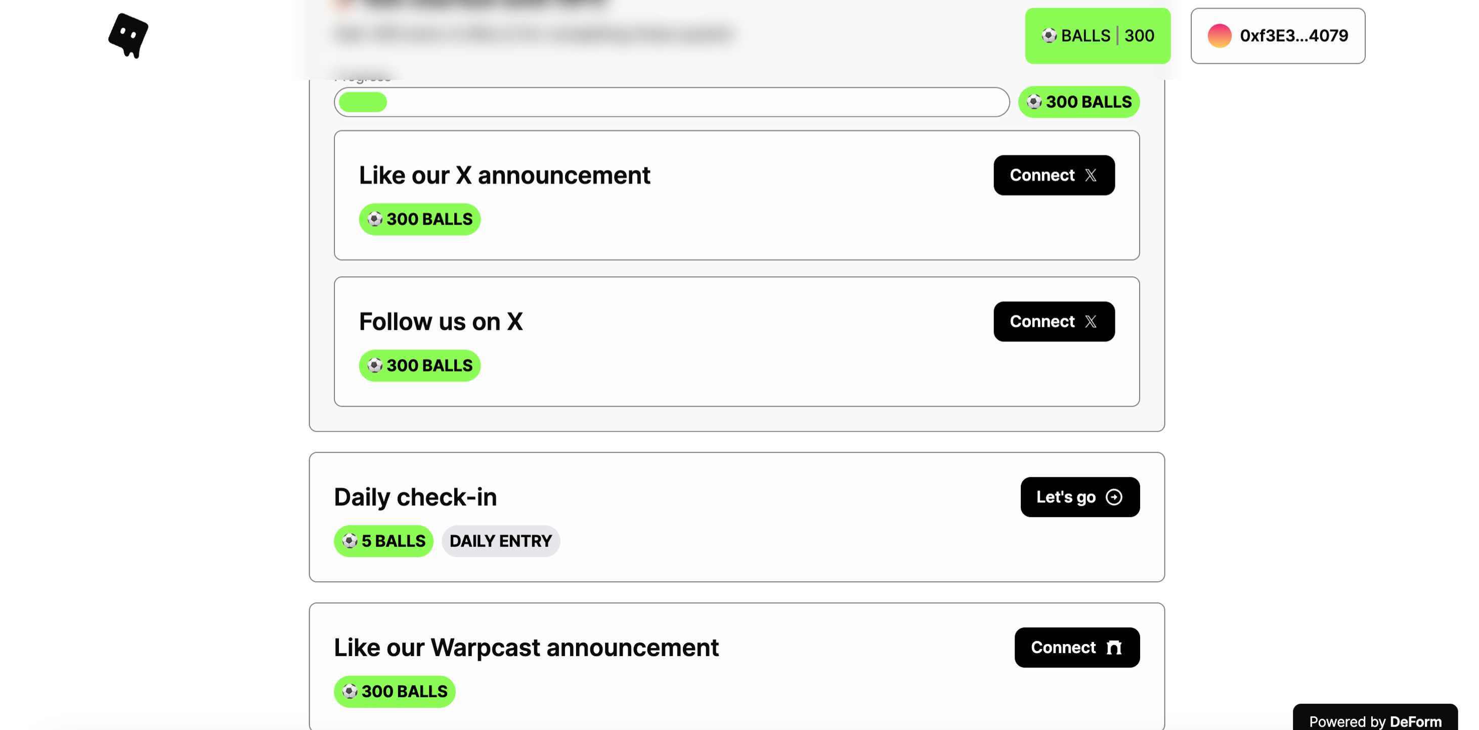 At the moment, there has been no announcement about the launch of the Pre-TGE portal, but the link to the Balls farming website now leads to this portal. So we can consider this activity official. On the portal, you can see the number of Balls you have earned and earn a little more for completing tasks and minting a badge.