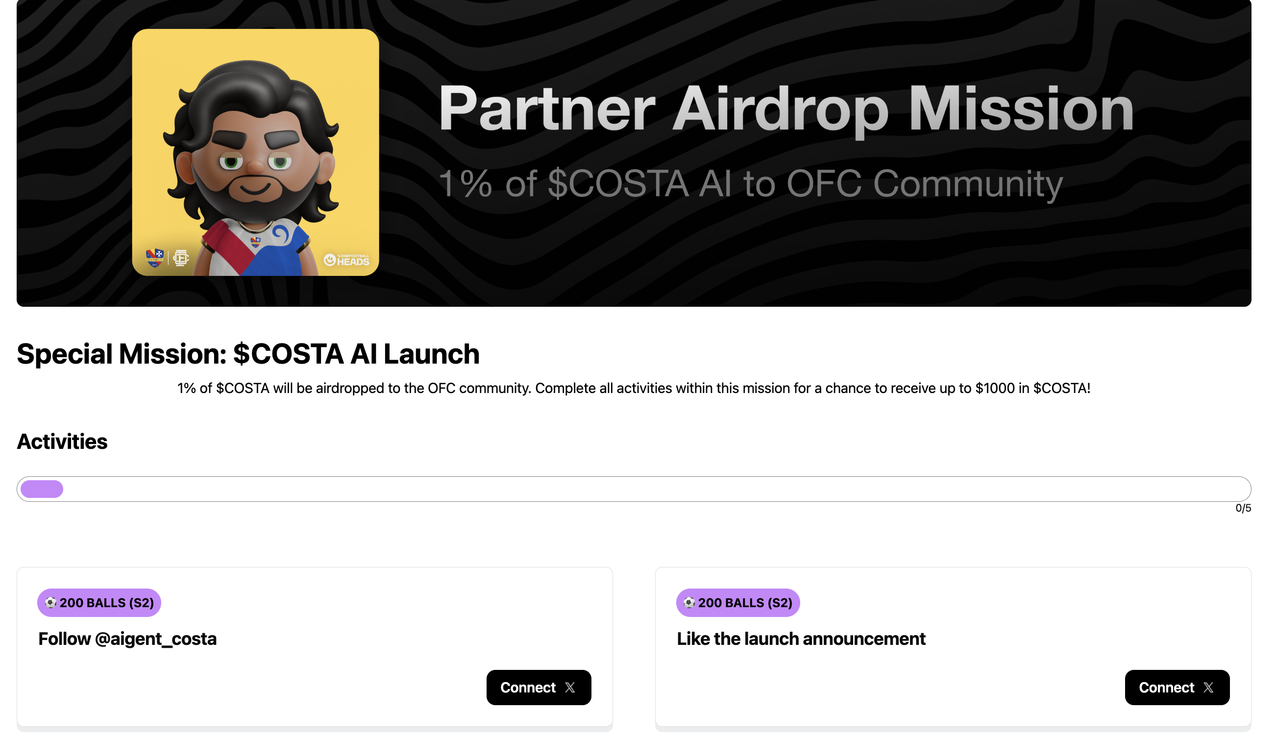 A special mission has been added to the Onefootball website. We can complete social tasks and earn 1500 points as well as a chance to win up to $1000 in $COSTA.