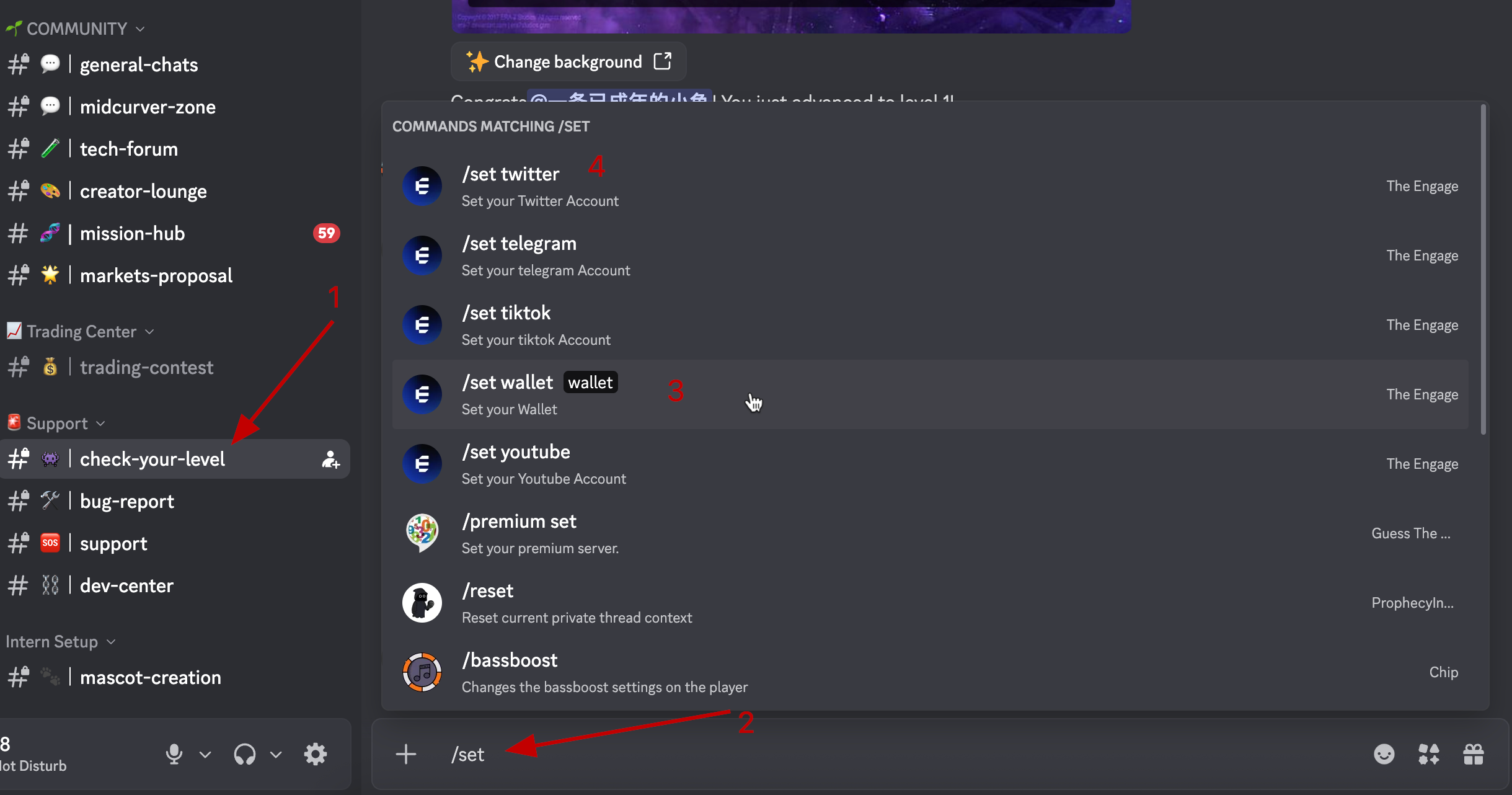 2. Open the #check-your-level channel, enter the command /set-wallet/twitter, and connect your wallet/X: