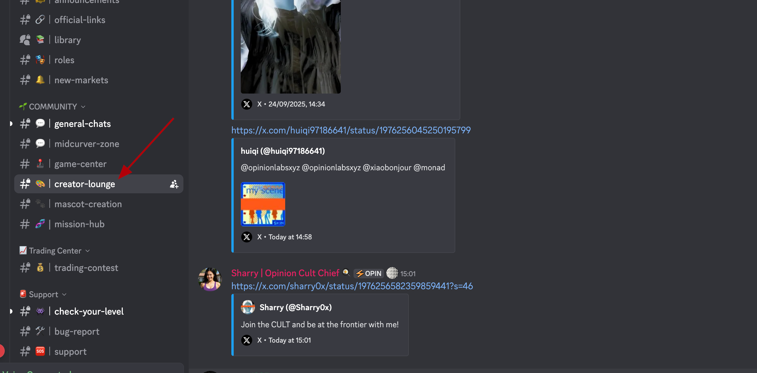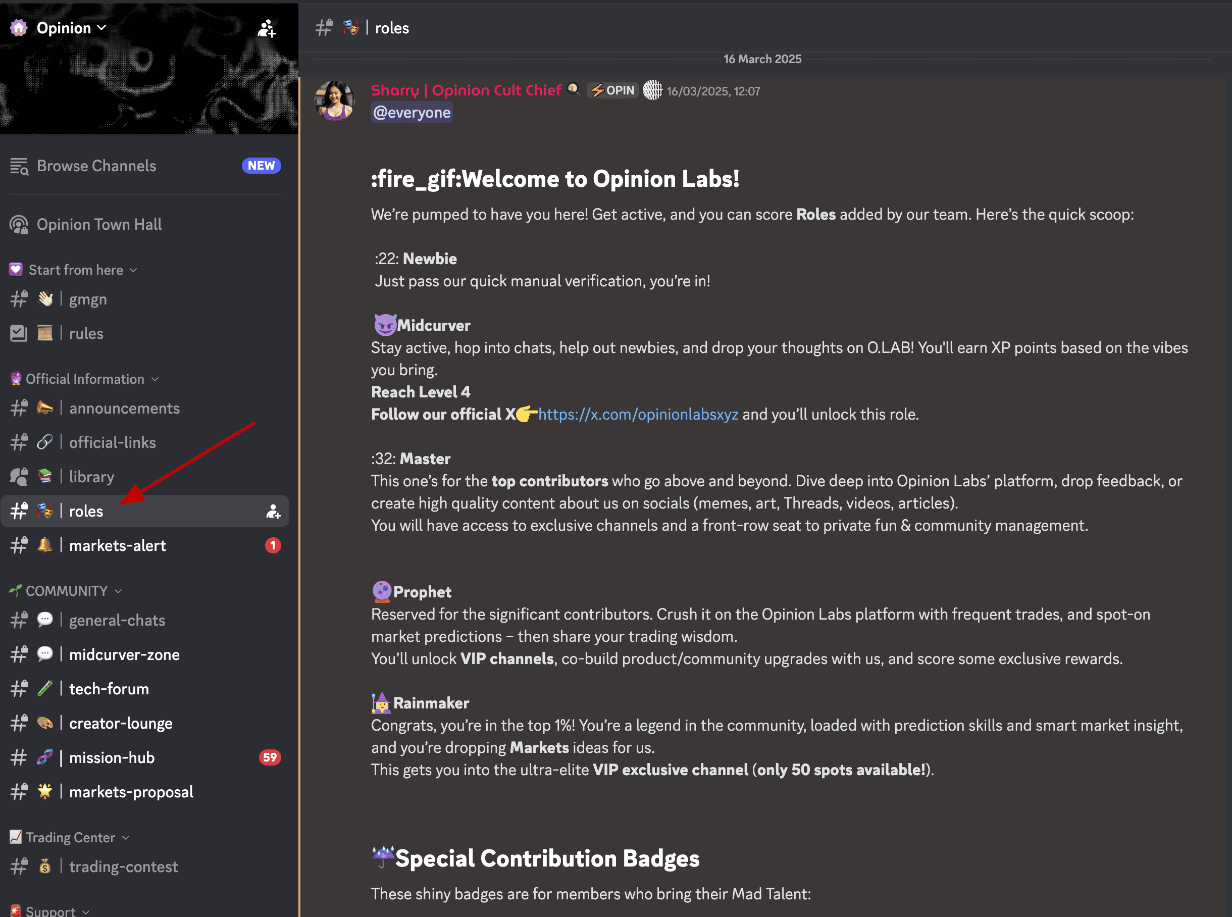 There are several roles in the project's Discord that can be obtained for creating content, memes, and other activities on the server. In addition, there was a previous announcement about the importance of connecting your wallet to Discord. Therefore, if you are betting on Opinion and have obtained several roles, be sure to connect your wallet and X account to Discord.