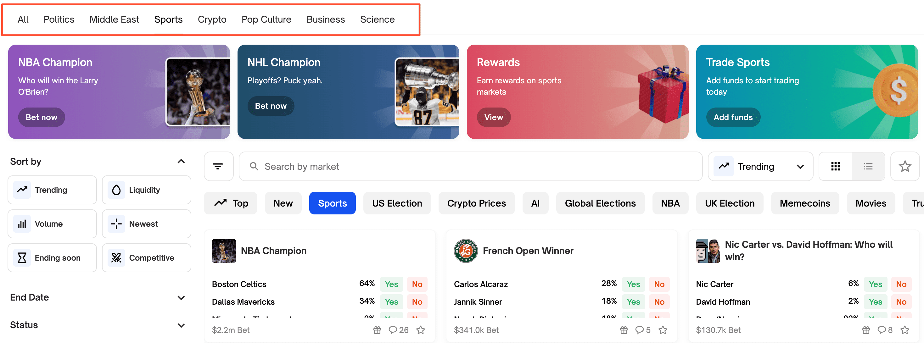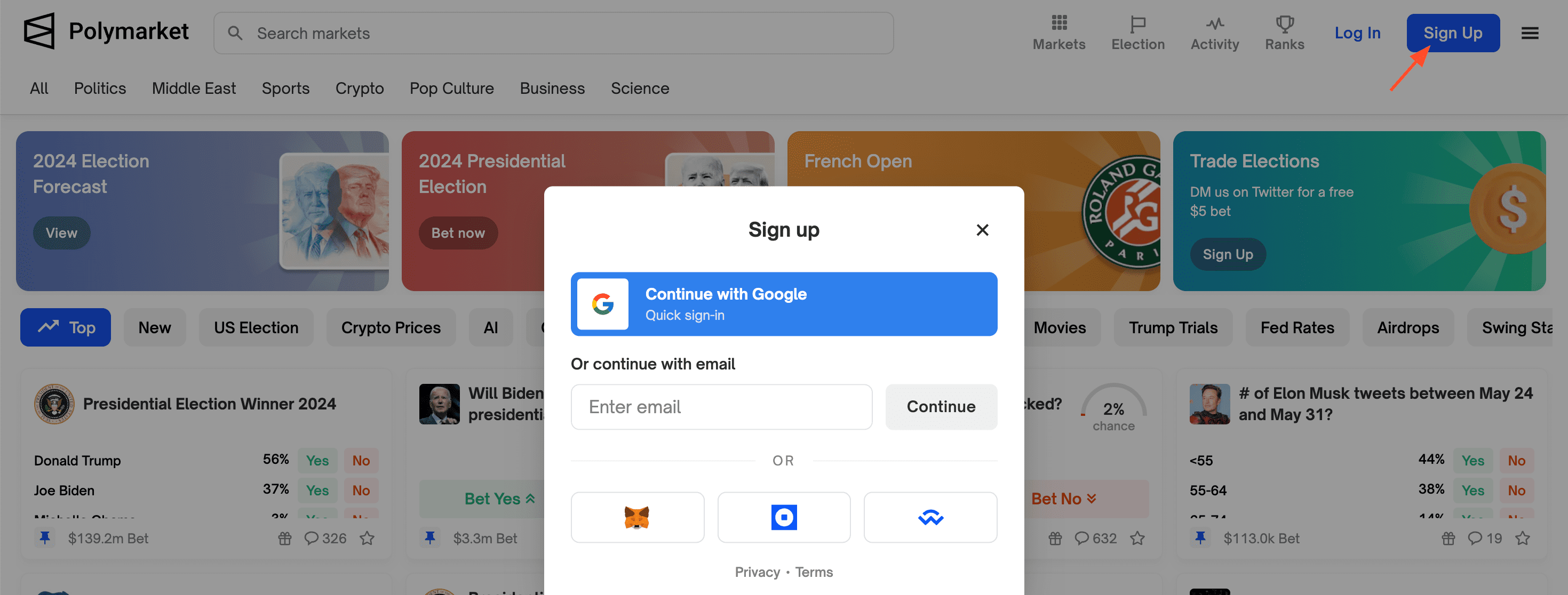 Polymarket cho phép bạn đặt cược vào nhiều sự kiện khác nhau. Chúng tôi khuyên bạn nên đặt một vài cược với số tiền tối thiểu để đủ điều kiện nhận airdrop. Đừng mạo hiểm với số tiền lớn!