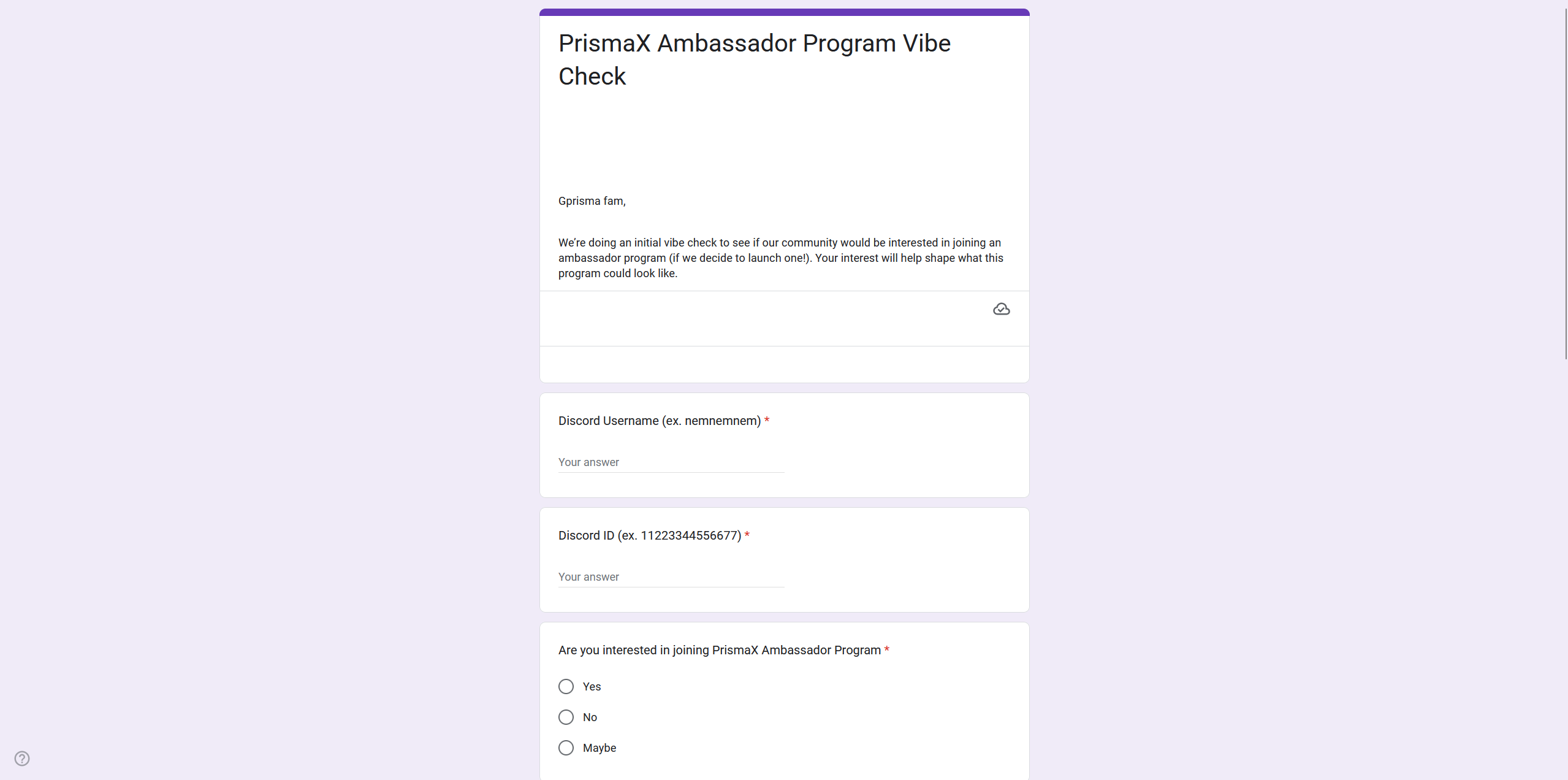 PrismaX has announced feedback on the ambassador program in Discord! You can fill out the form and share your feedback about the launch of the ambassador program.
