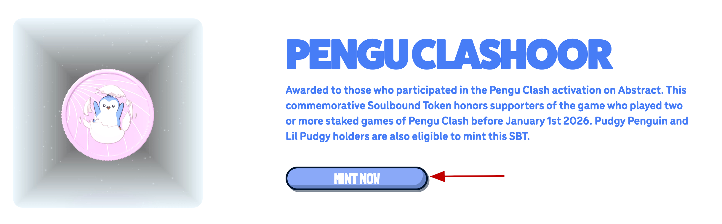 Pudgy Penguins has announced a new SBT mint for users who played Pengu Clash more than twice before January 1, 2026. There may be rewards for this SBT in the future.
