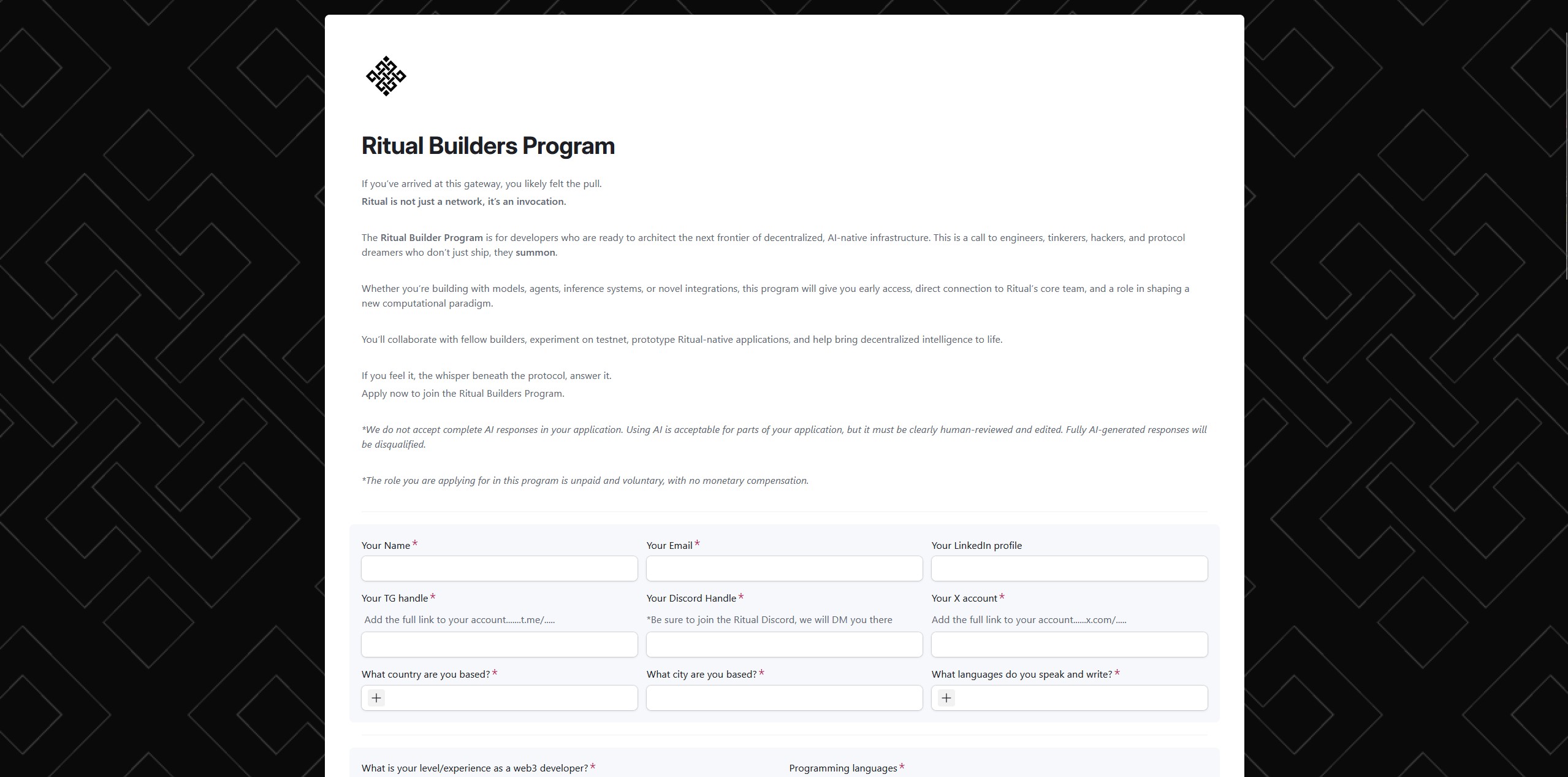 One of the team members of Ritual has announced the Builders Program! You can fill out the form and take your place in the ecosystem.