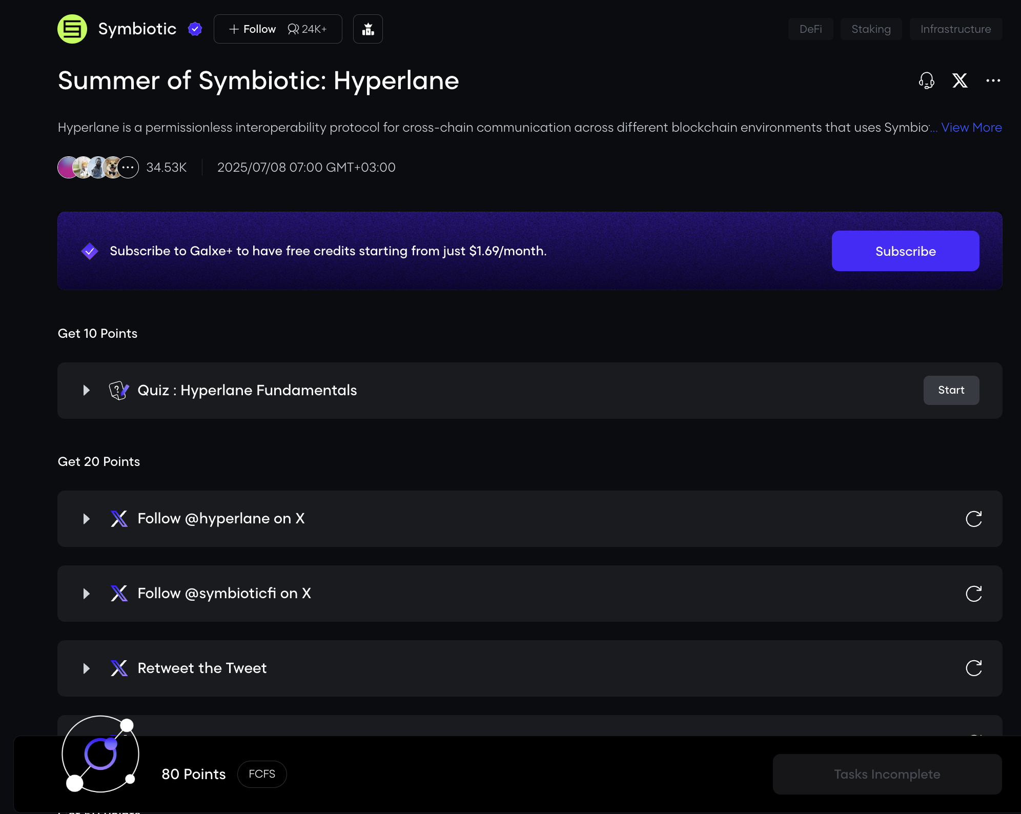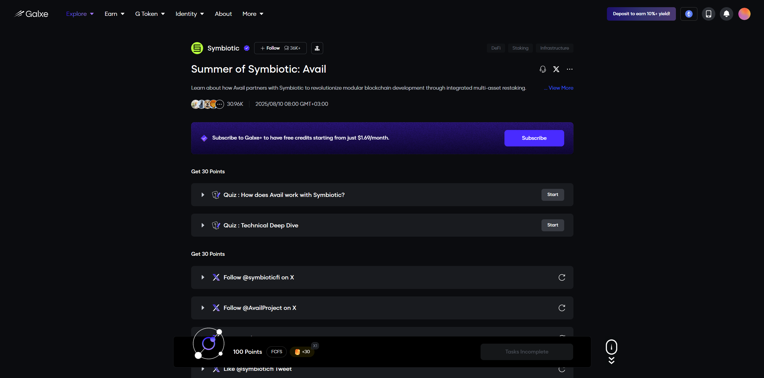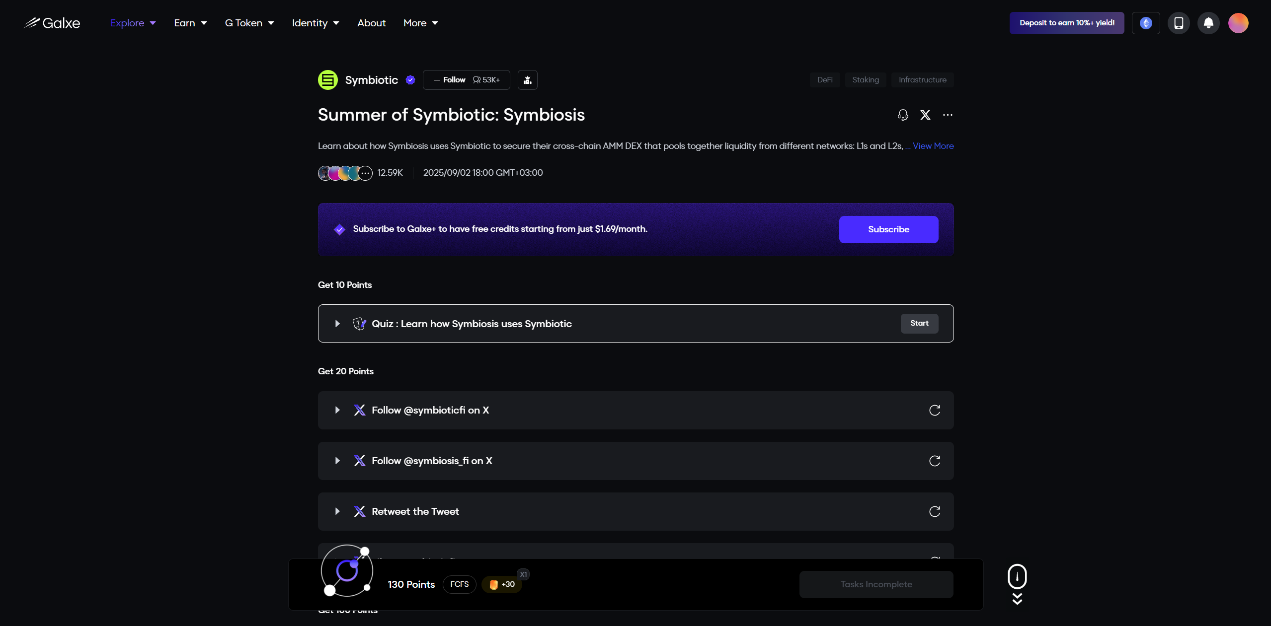 Symbiotic has launched a new campaign on Galxe! We can complete tasks and earn 130 points.