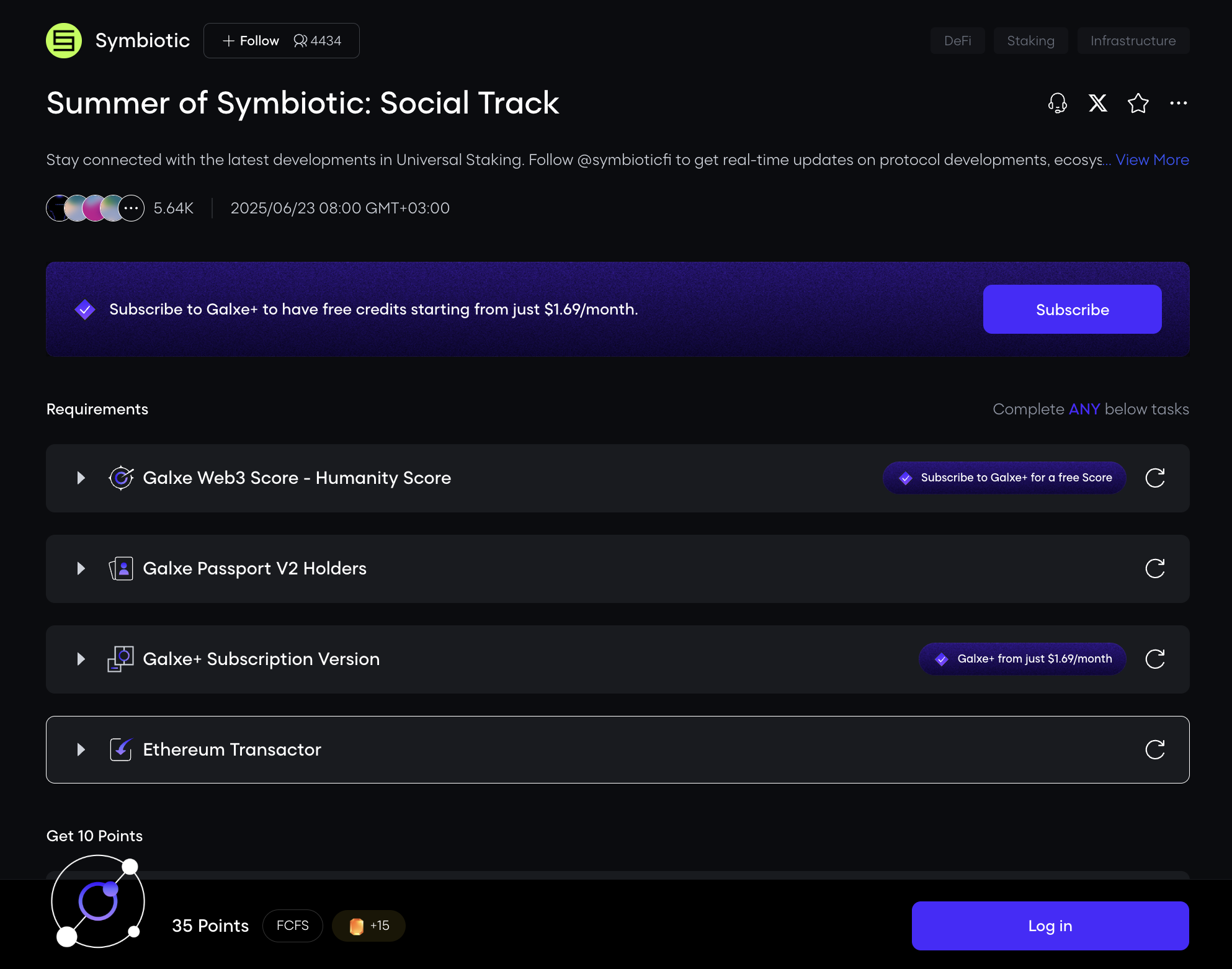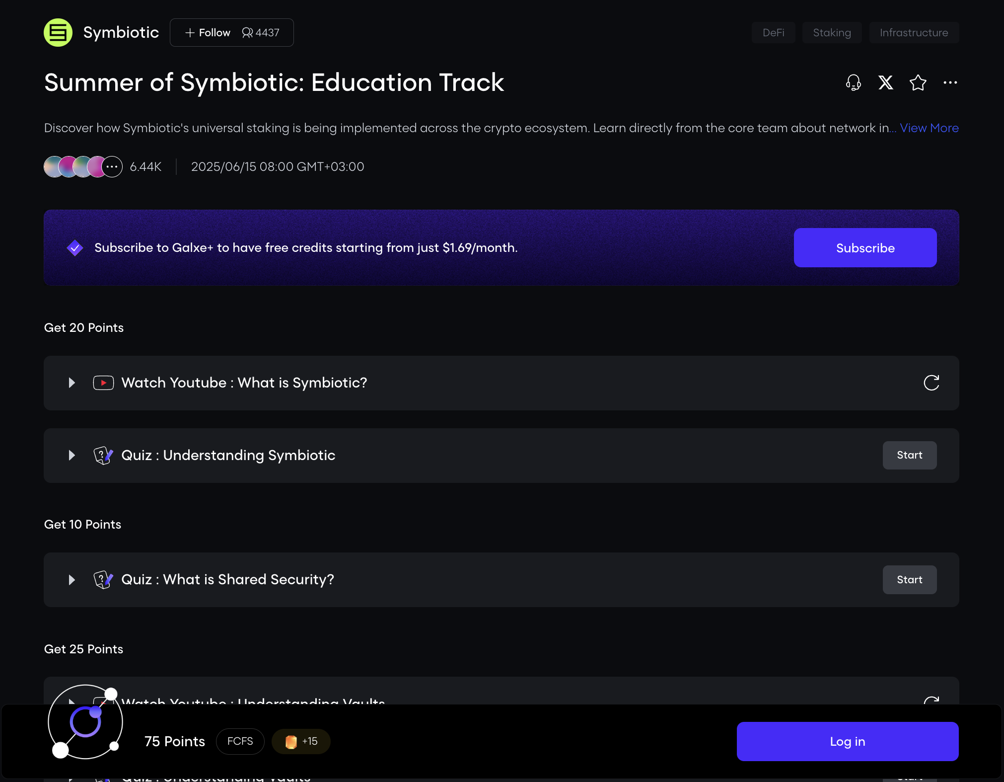 Symbiotic vừa khởi động một chiến dịch mới trên Galxe! Anh em mình có thể hoàn thành nhiệm vụ và kiếm 75 điểm.