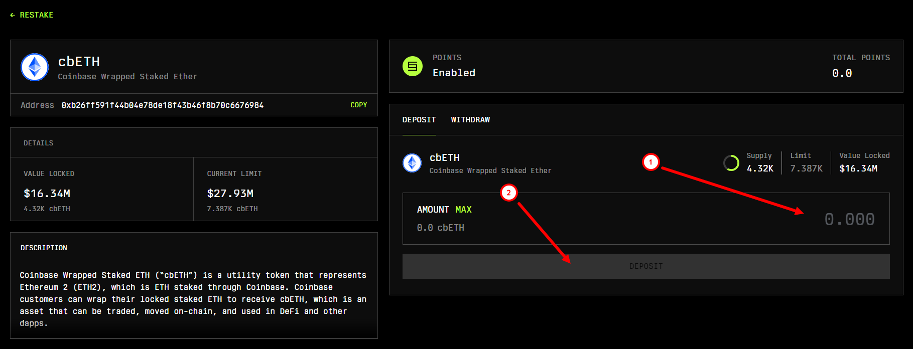 3. Gửi tài sản của bạn vào pool (1) bằng cách chọn số tiền bạn muốn và nhấp vào nút "Deposit" (2).