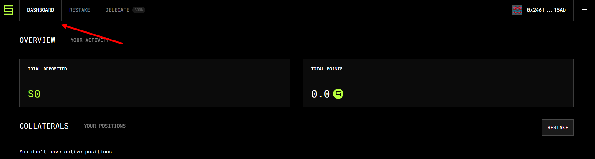 4. Theo dõi tiến trình của bạn trong tab "Dashboard" và chờ đợi các hoạt động hoặc pool mới mở.
