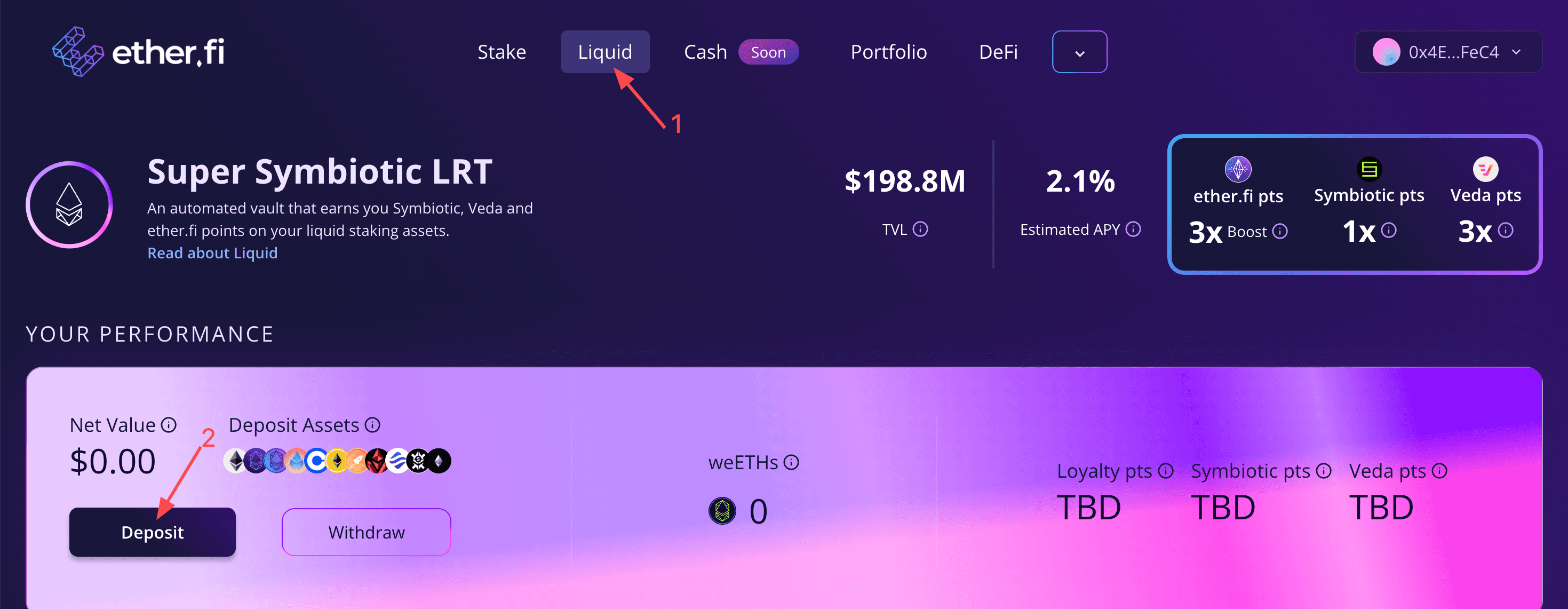 2. Bay vô tab Liquid và chọn Symbiotic. Nhấp vào "Deposit":