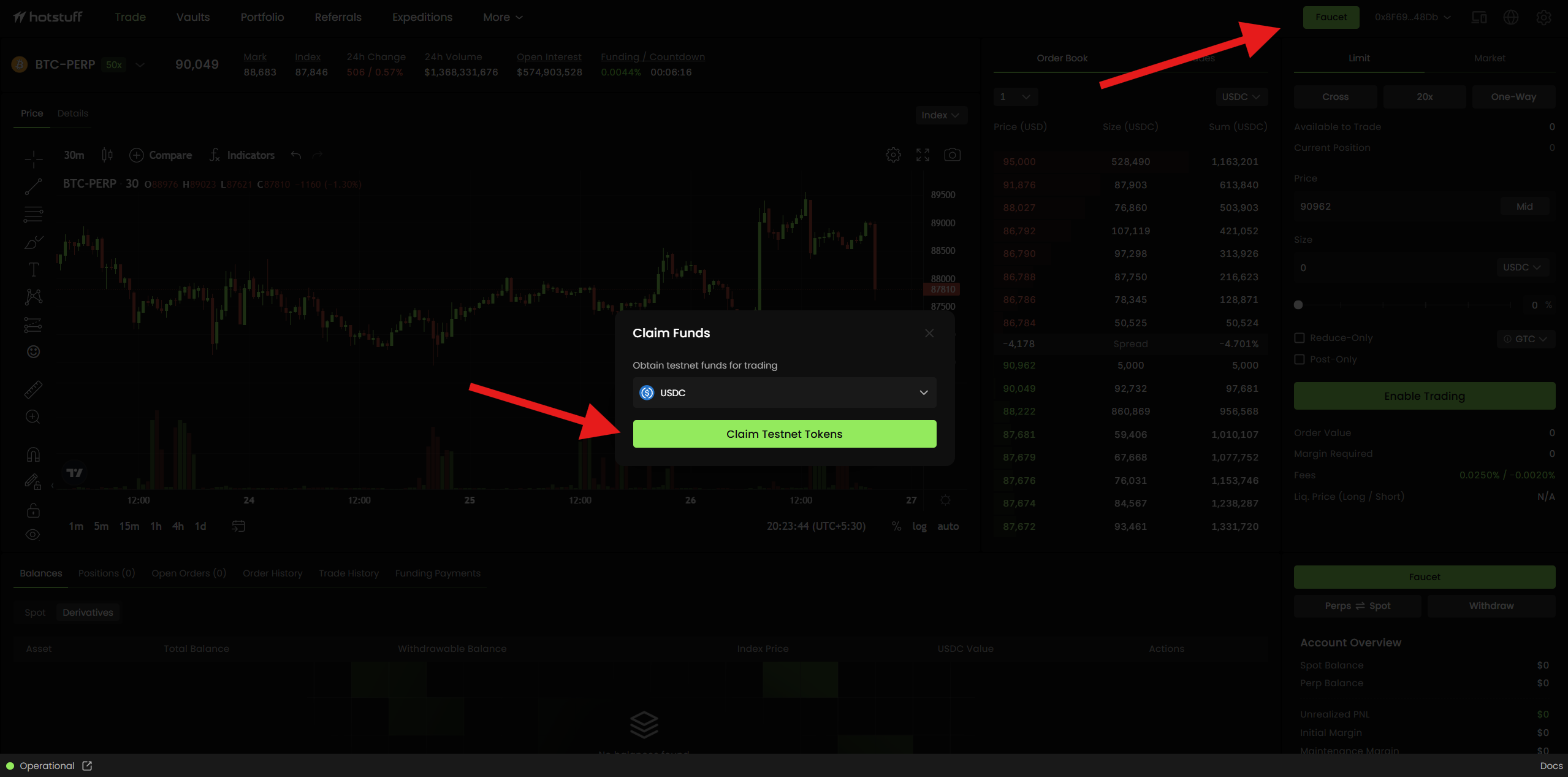 2. Click Faucet and claim test stablecoins.