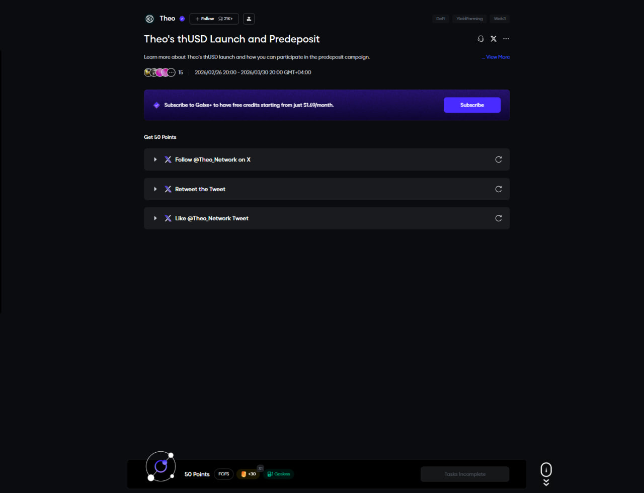 A new campaign, Theo's thUSD Launch and Predeposit, is available on the Galxe platform. You can complete simple social tasks and earn 50 points.