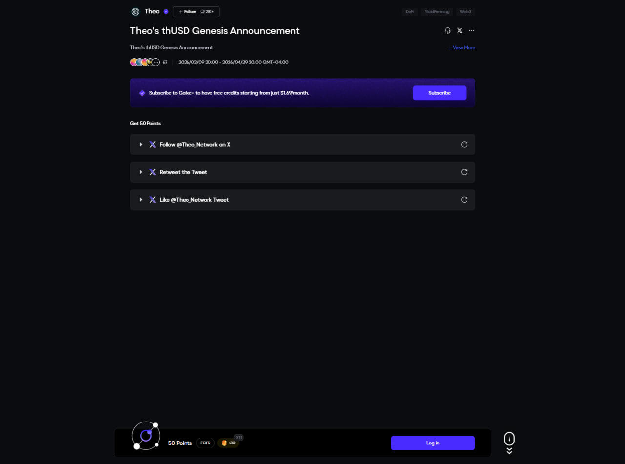 A new campaign, Theo's thUSD Genesis Announcement, is available on the Galxe platform. You can complete simple social tasks and earn 50 points.