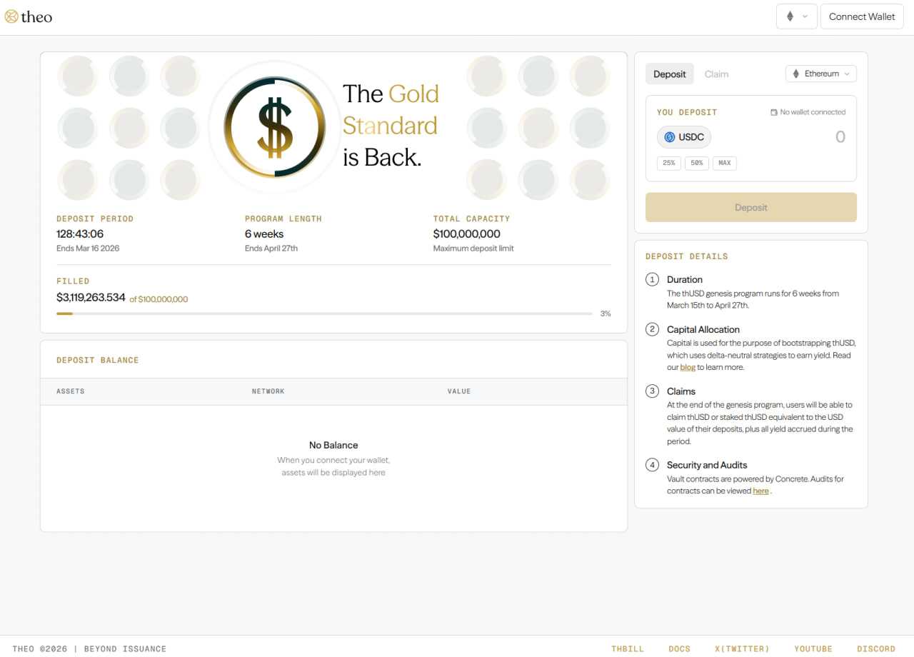 Theo announced the launch of pre-deposits as part of the Genesis program. You can deposit assets to receive the new stablecoin thUSD along with accumulated returns after the full launch.