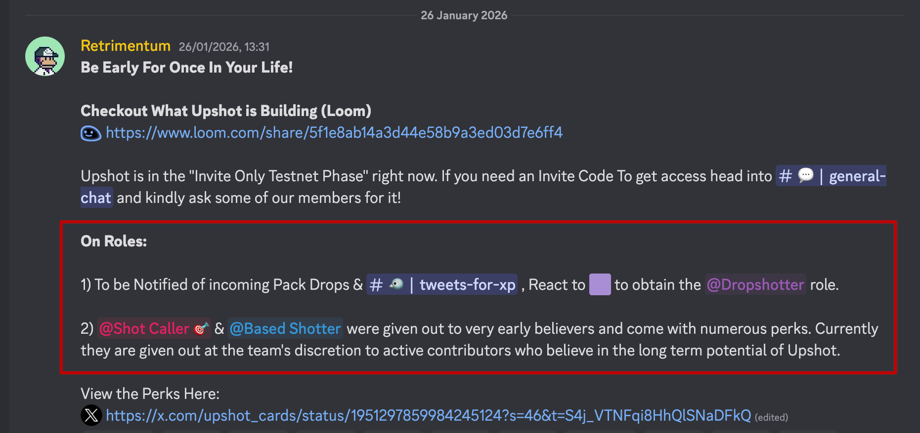 Currently, there are three roles in the Upshot project Discord. Anyone can obtain the Dropshotter role by clicking on the reaction. The Shot Caller and Based Shotter roles can be obtained by active content creators at the discretion of the team.